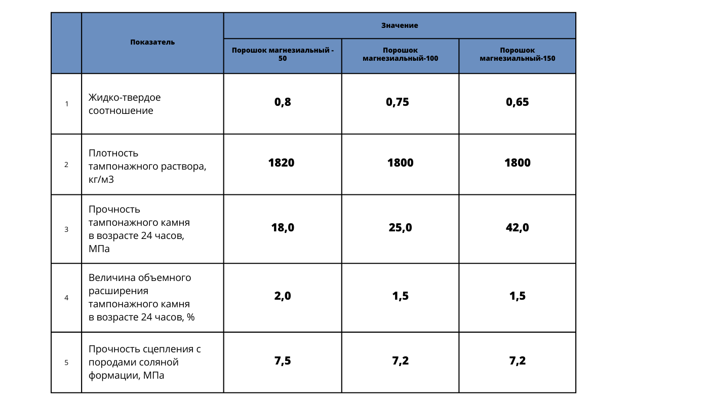Показатели свойств тампонажного раствора-камня на основе магнезиальных смесей производства «ПромХимДИНАМИКА».
